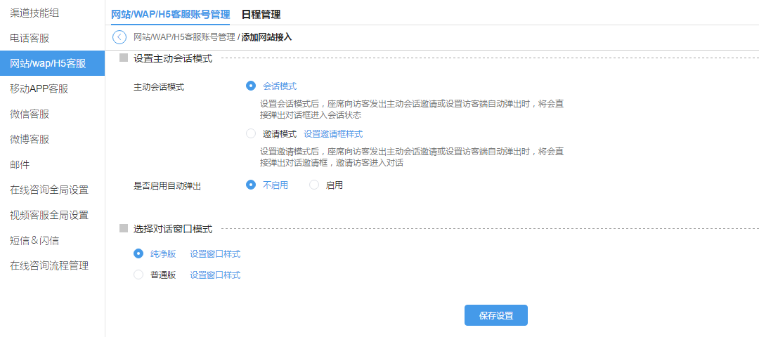 注意:不要启用日程,初始测试是没有配置相关流程,启用日程后会导致会话接入系统就直接关闭了。