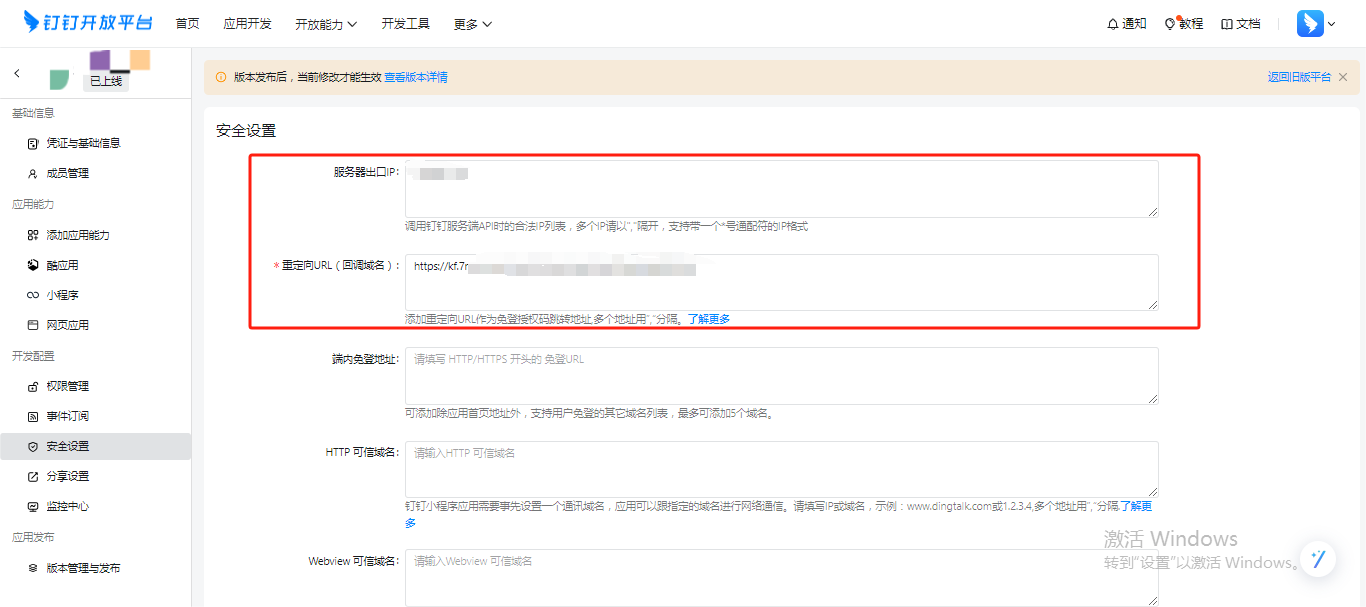 安全设置,填入服务器出口IP、重定向URL后点击“保存”